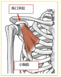 大胸筋、肩の前側、烏口周囲が硬いと肩関節が前方に固定され、背中は働きません。